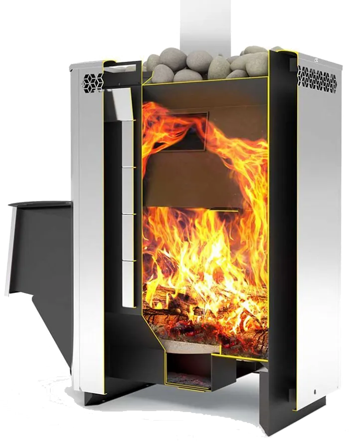 Бак для воды, камни и дымоход в комплектацию печи не входят.