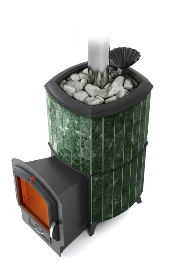 «Альфа Гардарика» – первая дровяная банная печь TMF в облицовке из природного камня. Стальная топка этой печи снаружи отделана вертикальными однородными ламелями из серпентинита.