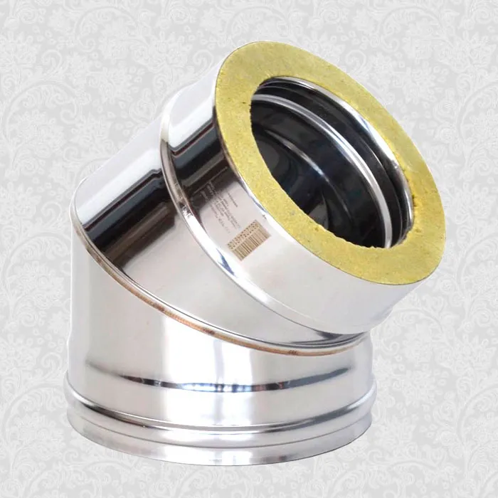 Для поворота дымохода на 45 градусов применяется специальный элемент – сэндвич-колено. Оно состоит из двух труб (внутренней и внешней), между которыми находится базальтовая минеральная вата для теплоизоляции. Изделие выполнено из нержавеющей стали.