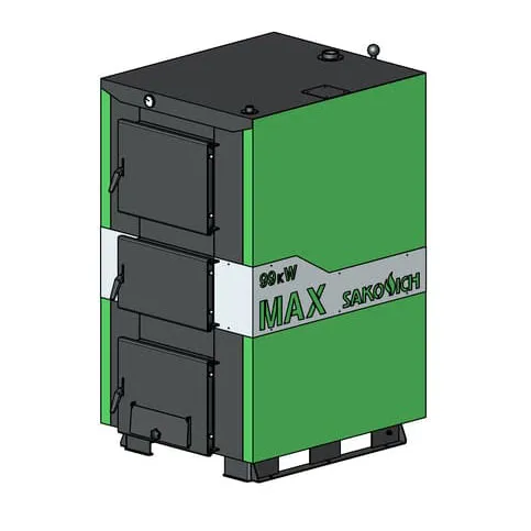 Теплообменник котла SAKOVICH MAX выполнен из котловой стали толщиной 6 мм с четырёхходовым горизонтальным преломлением, изолирован минеральной ватой и обшит металлической облицовкой, окрашенной полимерной краской. Водонаполненные колосники выполнены из бесшовной трубы толщиной 8 мм и диаметром 63,5 мм, благодаря чему в колосниках не происходит, перегрев теплоносителя.